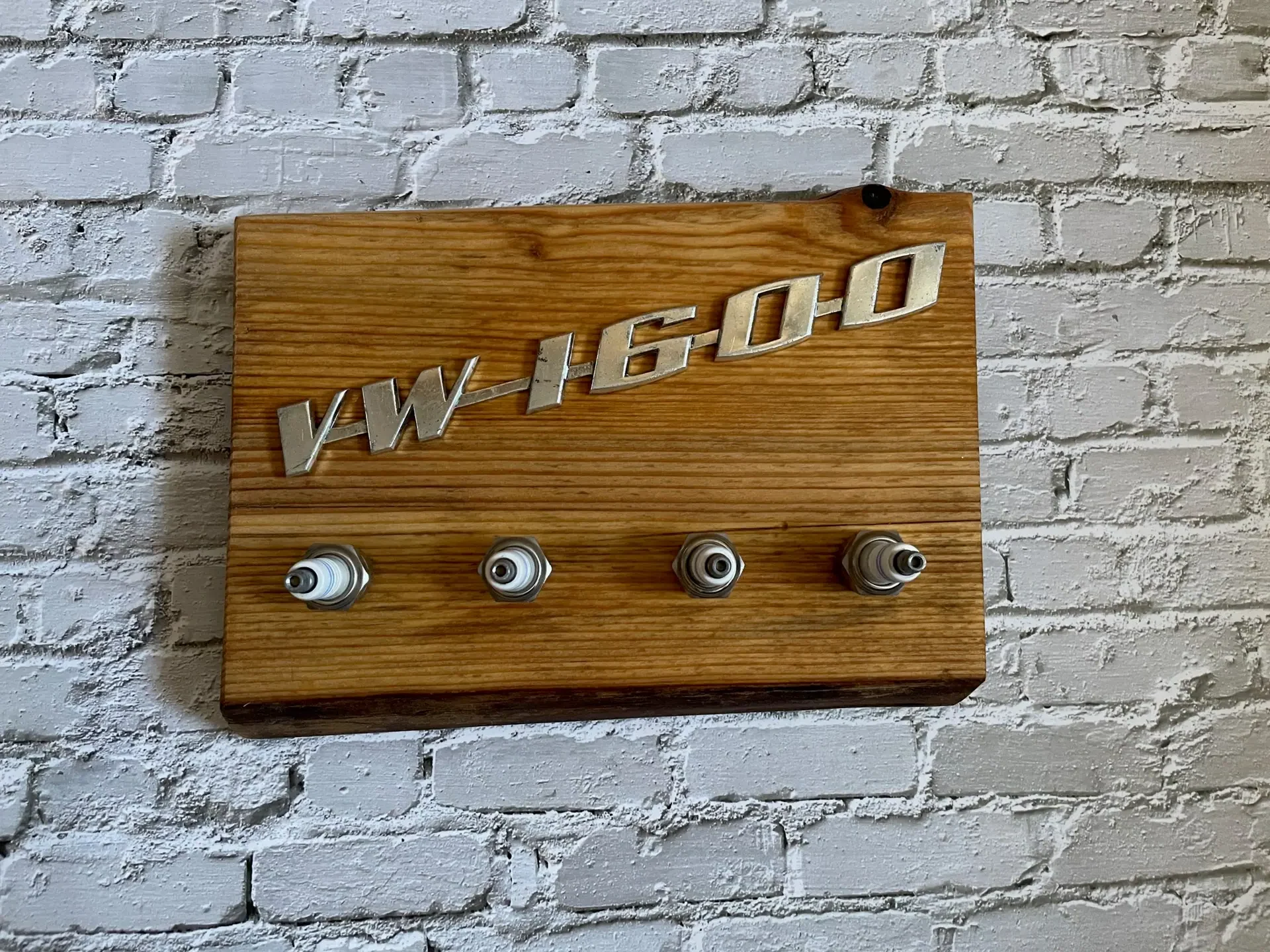 Aus Altholz mit origilal VW 1600 Logo und Zündkerzen aus einem VW Motor als Schlüsselhaken