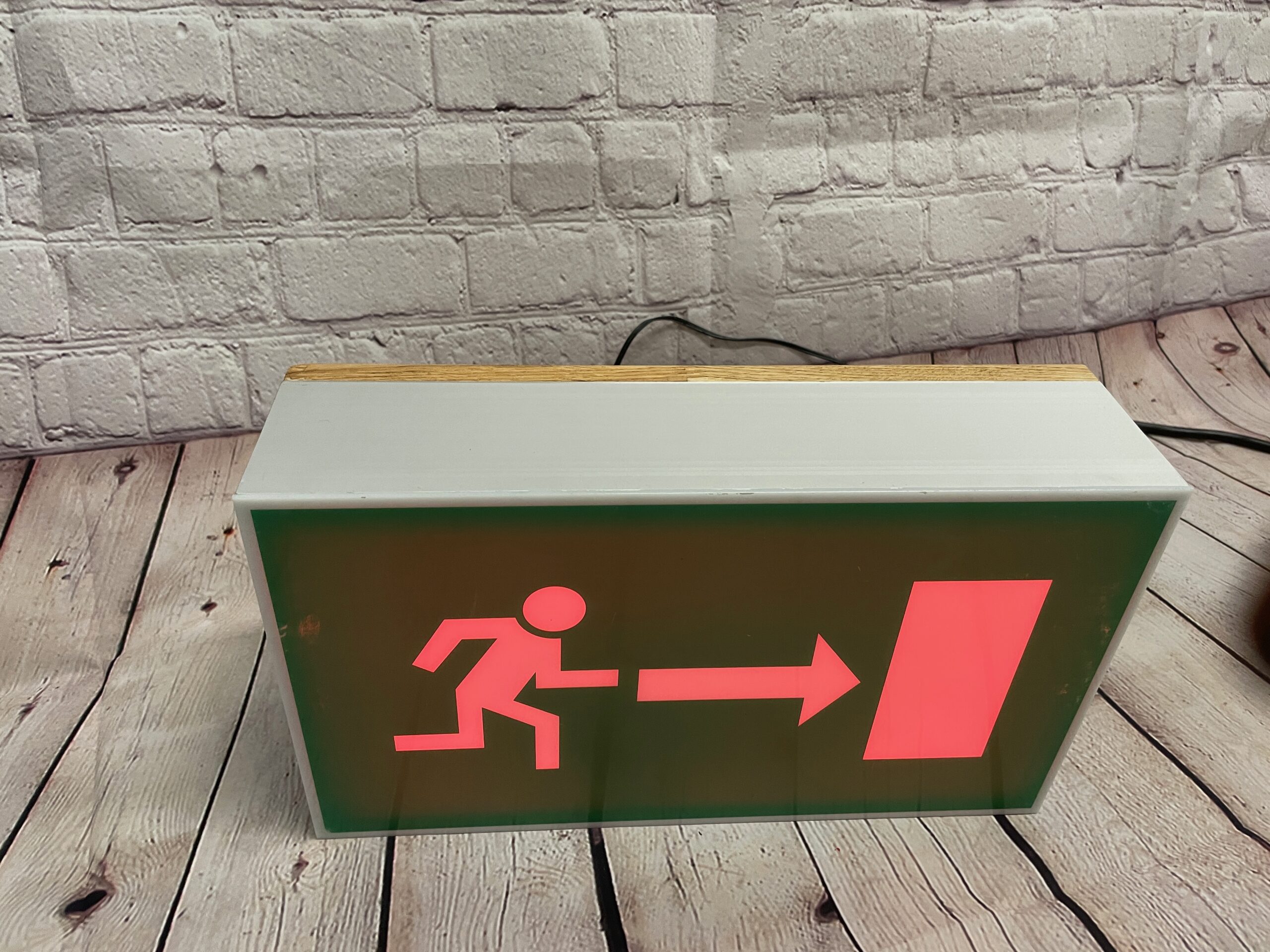 Diese Lampe besteht aus einer alten Notleuchte. Auf der Rückseite wurde ein Holzbrett bündig zum Gehäuse montiert. In der Leuchte wurde ein RGB LED Band eingebaut welches über eine Fernbedinung das EIN/AUS Schalten sowie die Auswahl verschiedener Farben ermöglicht. Auch fix programmierte Effekte können abgerufen werden.